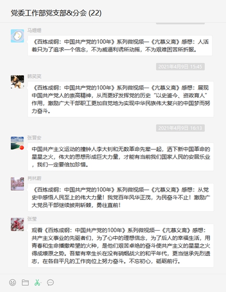 公司所屬各級黨組織堅持每日在支部工作群中推送《百煉成鋼:中國共產黨的100年》系列微視頻,通過8分鐘學習百年黨史,讓黨員干部更加理解中國共產黨為什么能、馬列主義為什么行,中國特色社會主義為什么好。利用“微分享”小窗口、大視角的形式開展黨史學習教育,打造指尖上的思想“加油站”。目前,公司所屬各級黨組織已推送《百煉成鋼:中國共產黨的100年》系列微視頻12期,每期都引發(fā)了黨員干部的熱評熱議。