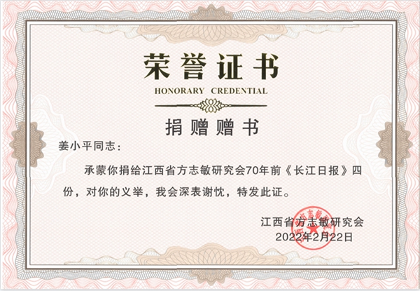 2月22日,陜建機(jī)股份公司職工姜小平收到了江西省方志敏研究會(huì)頒發(fā)的捐贈(zèng)證書,感謝他慷慨捐贈(zèng)4份70多年前《長(zhǎng)江日?qǐng)?bào)》的原版報(bào)紙,這些珍貴的史料再現(xiàn)了“方志敏同志戰(zhàn)斗的一生”。
