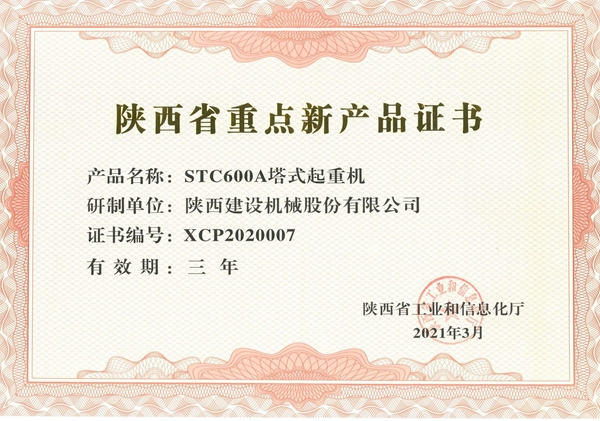 日前,陜西省工信廳下發(fā)通知,揭曉省重點(diǎn)新產(chǎn)品認(rèn)定名單。陜西建設(shè)機(jī)械股份有限公司自主研發(fā)的STC600A塔式起重機(jī)被認(rèn)定為陜西省重點(diǎn)新產(chǎn)品