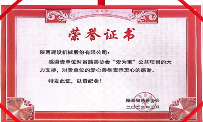 陜西省慈善協(xié)會(huì)授予陜建機(jī)股份“愛為寶”公益項(xiàng)目榮譽(yù)證書